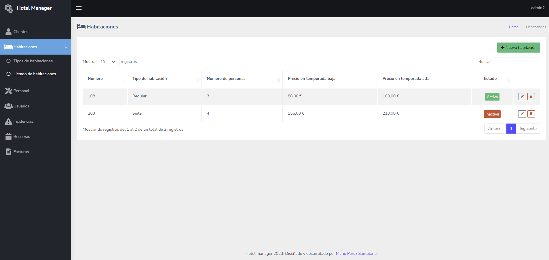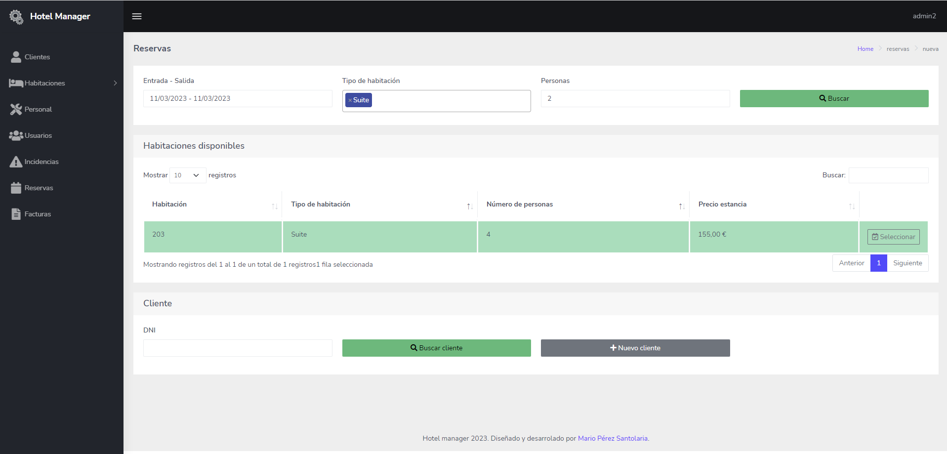 Hotel Manager es una aplicación web de gestión hotelera diseñada por mí como proyecto final del ciclo superior de Desarrollo de Aplicaciones Web. La aplicación es capaz de listar habitaciones, clientes registrados, usuarios con sus roles, reservas y las facturas de cada reserva. Permiote registrar nuevos clientes, gestionar usuarios, gestionar las incidencias y asignarles personal de mantenimiento, hacer reservas y más. Está dirigida a una familia ficticia que lleva en el negocio de la hostelería muy poco tiempo.